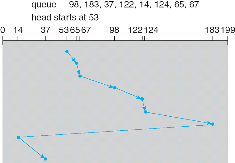 最短寻道时间优先(shortest-seek-time-first, SSTF) 算法选择对当前头位置而言寻道时间最小的请求。它和在 CPU 调度一讲中介绍的 SJF 算法很像。该算法的一个问题是可能导致一些请求进入饥饿状态,所以它并不像 SJF 那样是最优算法。