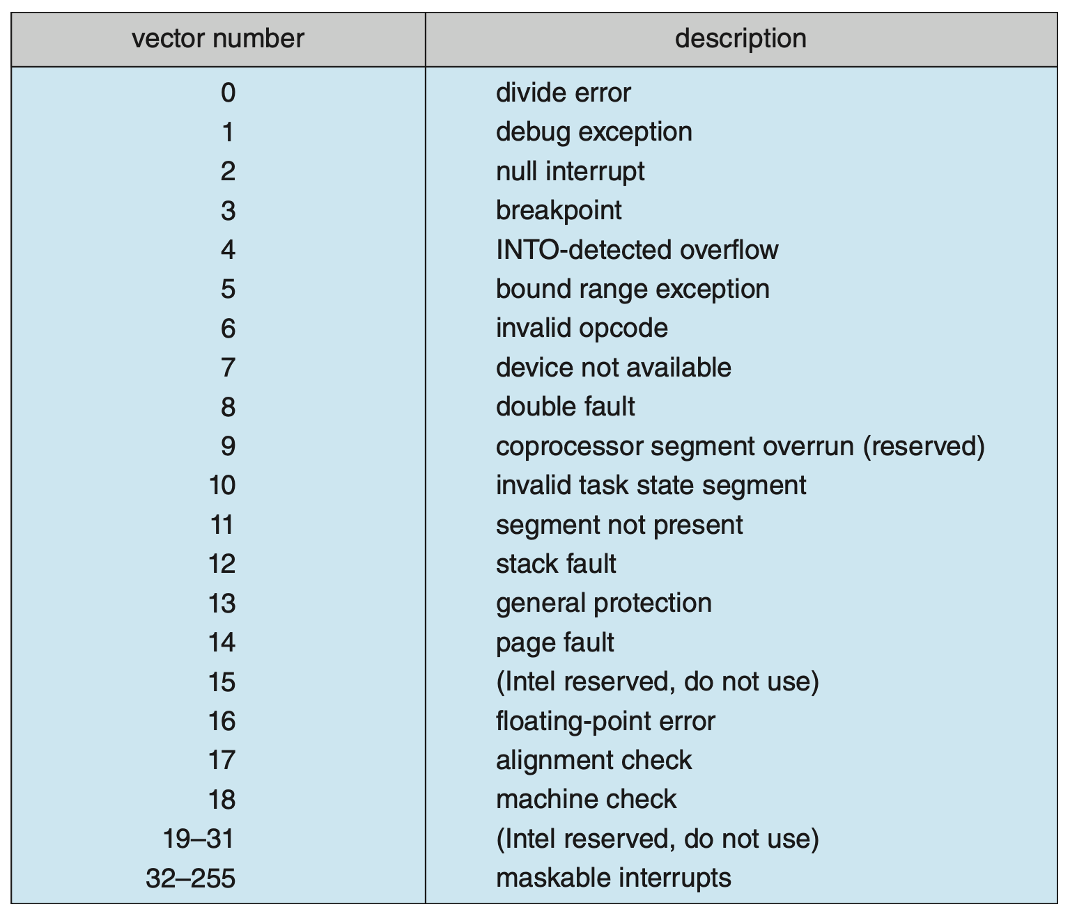 - 可屏蔽的(maskable) 中断:可在执行关键指令序列(期间不可发生中断)前由 CPU 关闭,为请求服务的设备控制器所用
