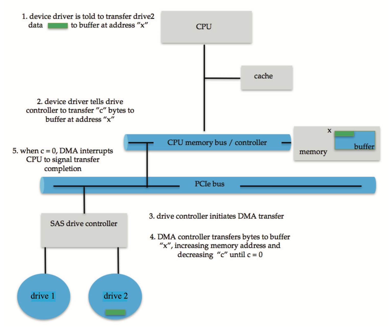 - DMA 控制器直接操作内存总线,将地址放置在总线上以执行传输,而无需 CPU 的帮助
