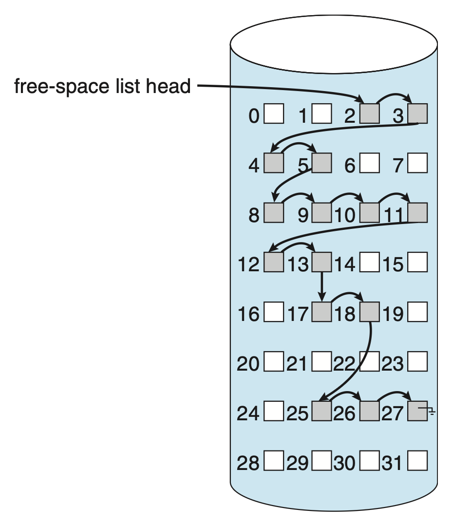 - 链接分配:任何块都有指向其下一个块的链接,因此整个文件可以从数据块中重建,目录结构也可以被重新创建