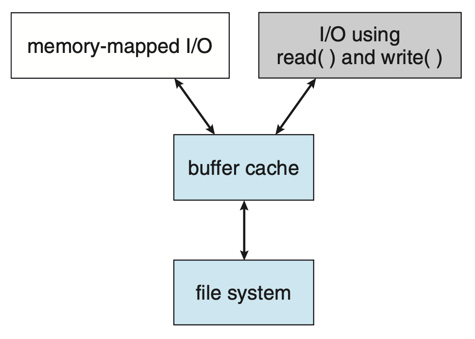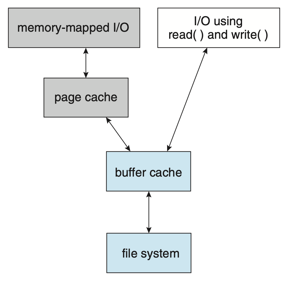 read()和write()系统调用通过缓冲区缓存进行- 但内存映射调用需要使用两个缓存,页缓存和缓冲区缓存