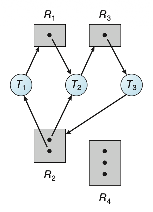 • 请求边(request edge) \(T_i \rightarrow R_j\):线程 \(T_i\) 正在请求 \(R_j\) 的一个实例,并且当前正在等待该资源