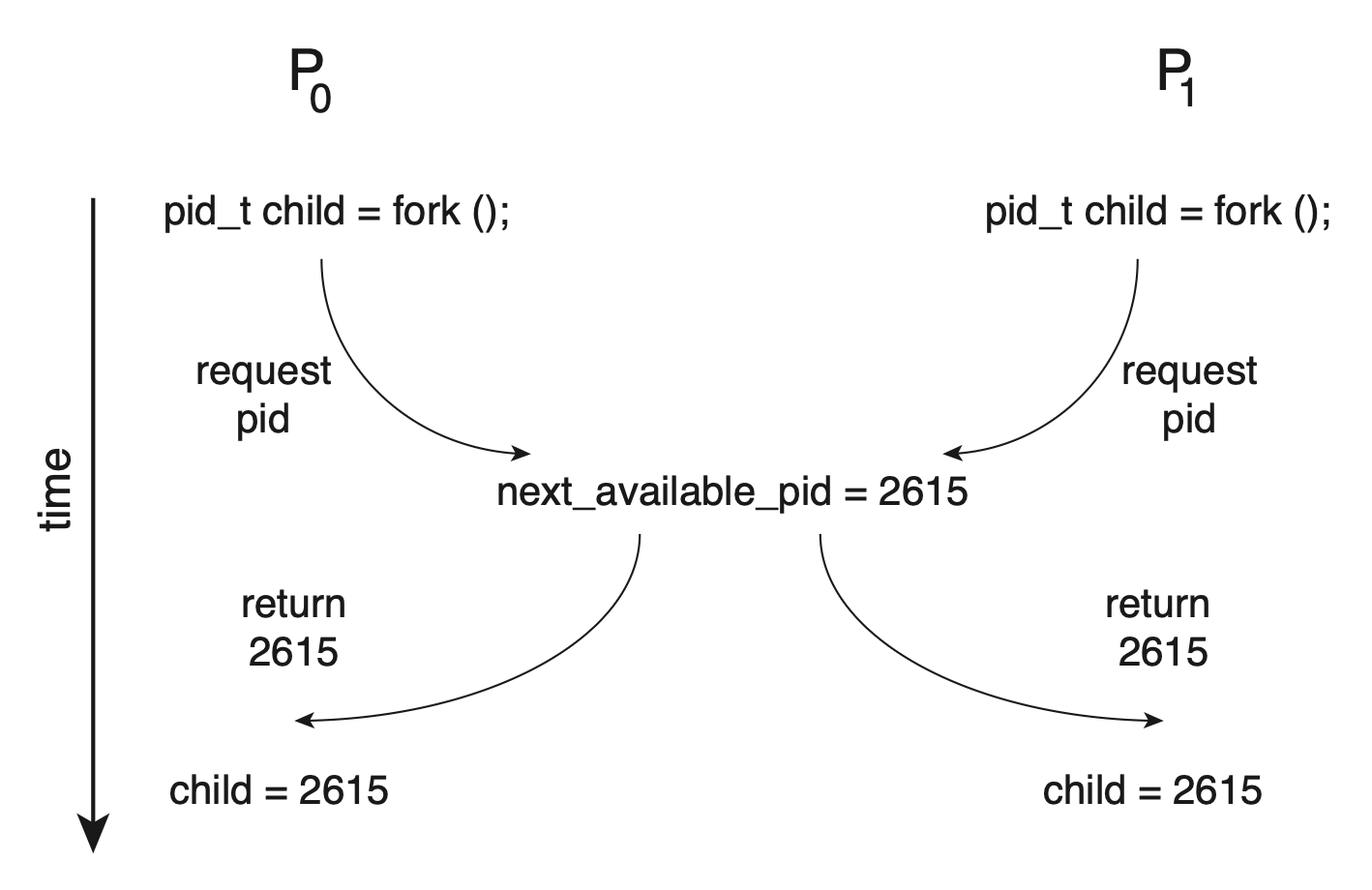 fork()创建各自的子进程。若两者并发执行,那么它们会在一个内核变量next_available_pid(字面意思)上存在竞态条件。除非使用互斥锁,否则相同的 pid 会被赋予给两个子进程。 -